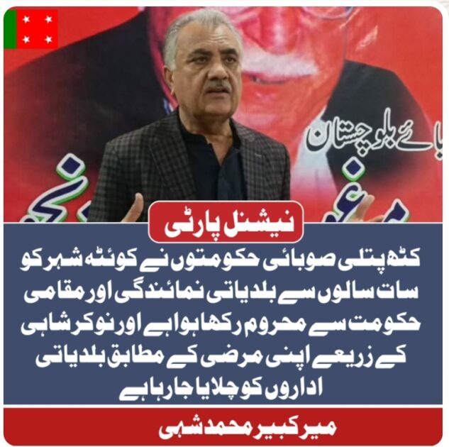 کوئٹہ(رپورٹر) نیشنل پارٹی کے مرکزی ترجمان نے کوئٹہ میں بلدیاتی انتخابات کے التواء پر سخت ردِعمل کا اظہار کرتے ہوئے کہا ہے کہ بلدیاتی انتخابات جمہوریت کی بنیادی اکائی اور نچلی سطح پر عوامی نمائندگی کی واضح علامت ہوتے ہیں، مزید پڑھیں