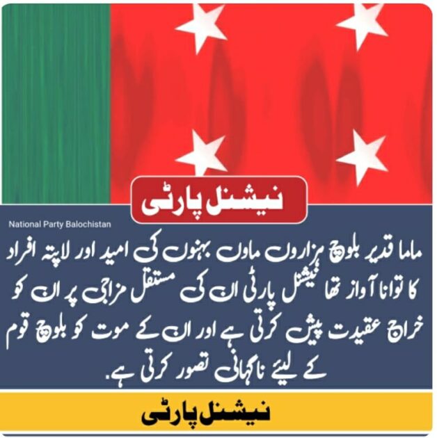 کوئٹہ (رپورٹر) نیشنل پارٹی کے صوبائی ترجمان نے ماما قدیر بلوچ کے موت کو بلوچ قوم بالخصوص لاپتہ افراد کے لیئے ایک قومی المیہ قرار دیتے ہوئے کہا ہے کہ ماما قدیر مرد آہن اور لاپتہ افراد کا تونا آواز مزید پڑھیں