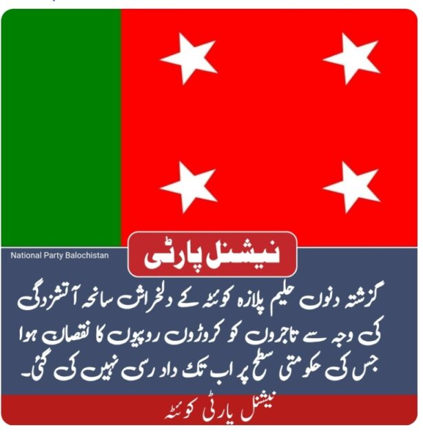 کوئٹہ (رپورٹر) نیشنل پارٹی کوئٹہ کے ترجمان نے اپنے بیان میں کہا کہ پرنس روڈ پر واقع حلیم پلازہ میں گزشتہ دنوں ایک دلخراش آتشزدگی کا واقعہ پیش آیا تھا جس میں تاجروں کو کروڑوں کا نقصان ہوا اس میں مزید پڑھیں