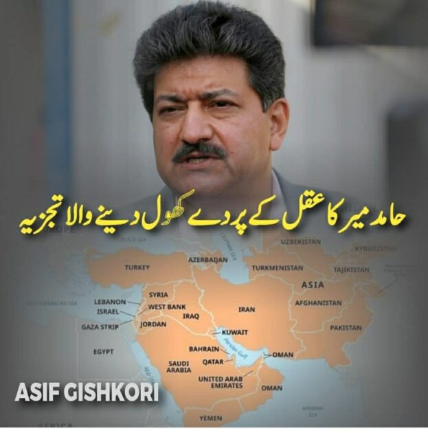 حامد میر نقشہ دیکھ لیجیے: ۔اسرائیل کی سرحد اردن سے ملتی ہے۔ اردن کی سرحد شام سے، شام کی سرحد عراق سے، اور عراق کی سرحد ایران سے جا ملتی ہے۔ ایران کے ساتھ پاکستان کی سرحد ملتی ہے۔ اب مزید پڑھیں