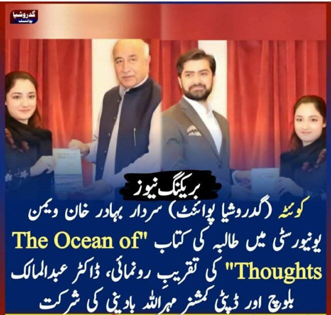 کوئٹہ(گدروشیا پوائنٹ)سردار بہادر خان ویمن یونیورسٹی میں طالبہ کی تصنیف کی تقریبِ رونمائی، ڈاکٹر عبدالمالک بلوچ اور ڈپٹی کمشنر کوئٹہ مہمانِ خصوصی. سردار بہادر خان ویمن یونیورسٹی میں ایک باوقار تقریب کے دوران طالبہ کی لکھی گئی کتاب “The Ocean مزید پڑھیں