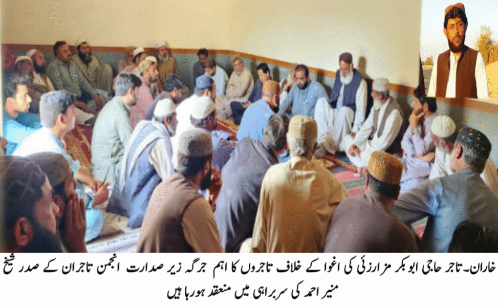 خاران( نمائندہ خصوصی محمدعیسی محمدحسنی ) خاران کے معروف کاروباری شخصیت حاجی محمد حیات مزارزئی کے فرزند تاجر حاجی ابوبکر مزارزئی کی اغوا کے خلاف تاجروں کا جرگہ انتظامیہ کو 24 گھنٹے کا الٹی میٹم دے دیا گیا ۔اس سلسلے میں خاران میں معروف تاجر حاجی محمد حیات مزارزئی کے فرزند تاجر حاجی ابوبکر مزارزئی کے اغوا کے خلاف مزارزئی ہاؤس میں جرگہ انجمن تاجران کے صدر شیخ منیر احمد کی سربراہی میں منعقد ہوا،جس میں تاجروں کی بڑی تعداد نے شرکت کی۔جرگے میں متفقہ طور پر فیصلہ کیا گیا کہ انتظامیہ کو 24 گھنٹے کا الٹی میٹم دیا گیا کہ حاجی ابوبکر مزارزئی کو فوری بازیاب کرایا جائے، اگر فوری طور پر بازیاب نہیں کیا گیا تو بصورت دیگر ہفتے کے روز سے مکمل غیر معینہ مدت کے لیے شٹر ڈاؤن ہڑتال اور بھرپور احتجاج کیا جائے گا۔جرگے میں شرکت کرنے والے سینئر تاجروں میں حاجی محمد ایوب مزارزئی، حاجی محمد عالم کبدانی، حاجی شفیع محمد کبدانی، حاجی محمد موسیٰ مزارزئی، حاجی علی محمد مزارزئی، حاجی عطاء اللہ ڈومکی، حاجی عبدالرؤف بنگلزئی، حاجی ثناء اللہ سیاہ پاد، حاجی نوراللہ شاہوزئی، حاجی عبدالغفار مسکانزئی، حاجی ادریس احمد مسکانزئی، خلیل عالم کبدانی، محمد عارف لعل، خالد ساسولی، ضیاء جان، حاجی ممتاز شاہوانی، حاجی عزیز جان سیاہ پاد، حاجی محمد حنیف مزارزئی، حاجی محمد عارف، عارف محمد حسنی، عتیق لالا و دیگر تاجروں کی کثیر تعداد میں شامل تھے