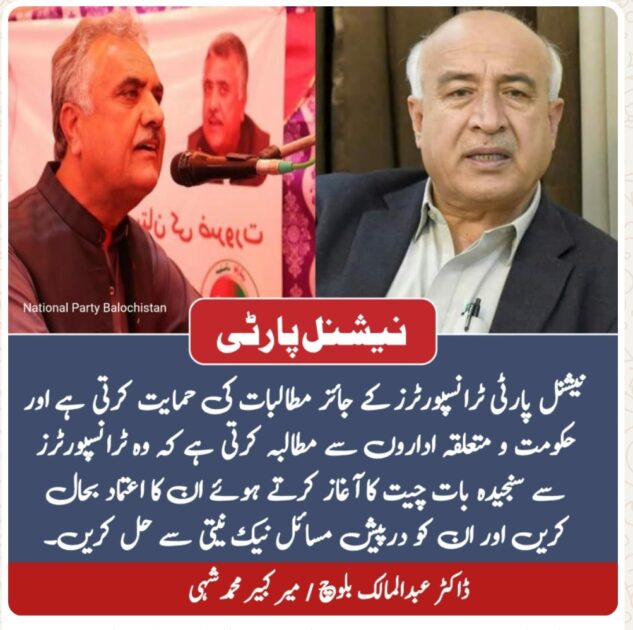 کوئٹہ (رپورٹر) نیشنل پارٹی کے مرکزی صدر ڈاکٹر عبدالمالک بلوچ اور مرکزی سیکرٹری جنرل میر کبیر محمدشہی نے اپنے جاری کردہ بیان میں کہا ہے کہ حکمران سندھ و بلوچستان بس ٹرانسپورٹرز کے جائز مطالبات تسلیم کرتے ہوئے ٹرانسپورٹرز کو درپیش مسائل فوری طور پر حل کریں۔ بلوچستان میں ٹرانسپورٹ کا شعبہ عرصہ دراز سے مسائل کی زد میں ہے تاہم ارباب اختیار کی عدم دلچسپی اور متعلقہ اداروں کے ناروا سلوک کے باعث مسائل کی نوعیت اور سنگینی میں اضافہ ہوتا جارہا ہے۔ مکران روٹ کے ٹرانسپورٹرز کی جانب سے جاری ہڑتال اور احتجاجی دھرنا درپیش صورتحال کی سنگینی کی عکاسی کرتا ہے جس کے باعث ٹرانسپورٹرز کو اپنی بسیں روک کر احتجاج کا راستہ اپنانا پڑا ہے۔ ٹرانسپورٹ کا شعبہ معیشت سمیت ہر شعبہ زندگی کی فعالیت اور ترقی کے لیے لازم ملزوم ہے تاہم اتنے اہم شعبے کو منفی طرز عمل اور ناروا سلوک کے زریعے تباہی کی طرف لے جانا بلوچستان کے عوام کو دستیاب محدود مواقع مزید مسدود کرنے کے مترادف ہے۔ مکران سے کراچی روٹ پر کوسٹل ہائی وے اور آر سی ڈی شاہراہ پر سیکورٹی چیک پوسٹوں پر مسافروں کو بلاجواز تنگ کرنے، ڈرائیوروں سے ناروا سلوک اور بھتہ خوری کی شکایات تشویشناک ہیں۔ بلوچستان میں روزگار کے زرائع پہلے ہی ناکافی اور کاروبار کے مواقع محدود ہیں مگر یہاں کے عوام کے لیے معاشی مواقع پیدا کرنے کے بجائے ناعاقبت اندیش اقدامات اور ہٹ دھرمی کے باعث دستیاب مواقع بھی مزید محدود کیے جارہے ہیں جسکی مثال بارڈر ٹریڈ، زراعت، ماہیگیری، کانکنی، انٹرنیٹ اور ٹرانسپورٹ کی صورتحال ہے۔ نیشنل پارٹی ٹرانسپورٹرز کے جائز مطالبات کی حمایت کرتی ہے اور حکومت و متعلقہ اداروں سے مطالبہ کرتی ہے کہ وہ ٹرانسپورٹرز سے سنجیدہ بات چیت کا آغاز کرتے ہوئے ان کا اعتماد بحال کریں اور ان کو درپیش مسائل نیک نیتی سے حل کریں۔