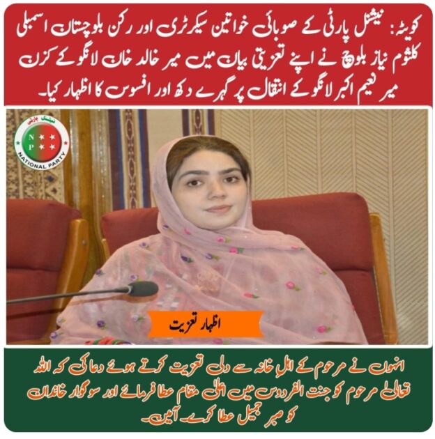 کویٹہ(رپورٹر)نیشنل پارٹی کے صوبائی خواتین سیکرٹری اور رکن بلوچستان اسمبلی کلثوم نیاز بلوچ نے اپنے تعزیتی بیان میں میر خالد خان لانگو کے کزن میر نعیم اکبر لانگو کے انتقال پر گہرے دکھ اور افسوس کا اظہار کیا۔