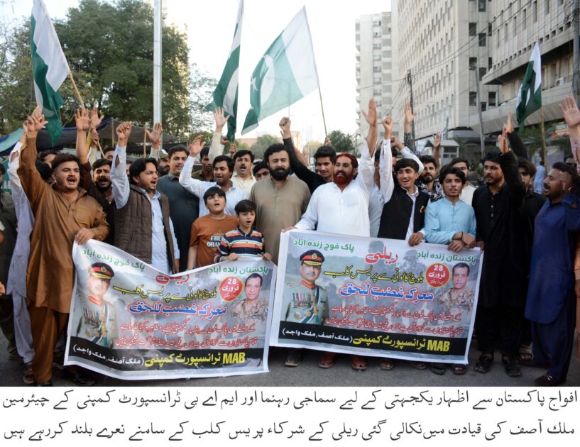 کراچی (اسٹاف رپورٹر) سماجی رہنما اور ایم اے بی ٹرانسپورٹ کمپنی کے چیئرمین ملک آصف کی قیادت میں افغانستان کی جانب سے مبینہ سرحدی خلاف ورزیوں اور پاکستان میں دہشت گردی کے واقعات کے خلاف پاک فوج کی جانب سے شروع کیے گئے معرکۂ غضبُ الحق کی حمایت میں ایک عظیم الشان ریلی نکالی گئی۔ ریلی بلوچ کالونی پل سے شروع ہو کر شارع فیصل اور صدر ٹاؤن سے گزرتی ہوئی کراچی پریس کلب تک پہنچی، جہاں شرکاء نے اجتماع کیا۔