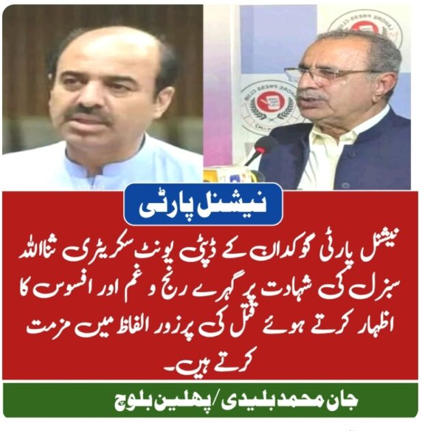 اسلام آباد(رپورٹر) نیشنل پارٹی کے رہنما سنیٹر جان محمد بلیدی اور رکن قومی اسمبلی واجہ پھلین بلوچ نے نیشنل پارٹی گوکدان کے ڈپٹی یونٹ سکریٹری ثنااللہ سبزل کی شہادت پر گہرے رنج و غم اور افسوس کا اظہار کرتے ہوئے قتل کی پرزور الفاظ میں مزمت کی اور حکومت سے مطالبہ کیا کہ فوری طور پر قاتلوں کی گرفتاری کے لیے اقدامات کئے جائیں۔ انھوں نے کہاکہ ریاست کی رٹ عملا ختم ہوگی ہے امن و امان کی بھگڑتی صورتحال نے پرامن لوگوں اور سیاسی کارکنوں کے لیے زندگی گزارنا مشکل بنادیا گیا ہے۔ نیشنل پارٹی کی لیڈرشپ نے ثنااللہ کی شہادت پر ان کے خاندان سے دلی تعزیت کا اظہار کرتے ہوئے دعا مغفرت کی۔