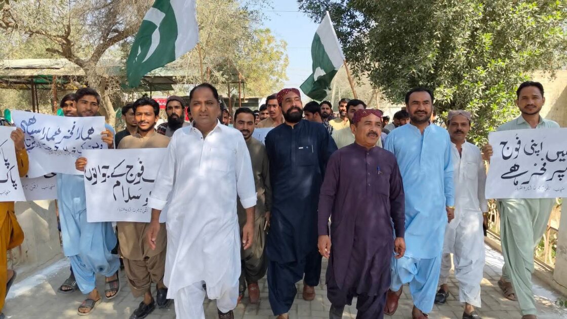 جعفرآباد (عطا محمد کھوسہ) جعفرآباد میں ضلعی انتظامیہ کی جانب سے ڈپٹی کمشنر جعفرآباد خالد خان کی قیادت میں پاک فوج سے اظہارِ یکجہتی کے لیے ایک بھرپور ریلی کا انعقاد کیا گیا۔ ریلی میں شہری اتحاد، انجمن تاجران، ضلعی افسران، سول سوسائٹی کے نمائندگان اور مختلف تعلیمی اداروں کے طلبہ نے بڑی تعداد میں شرکت کی۔