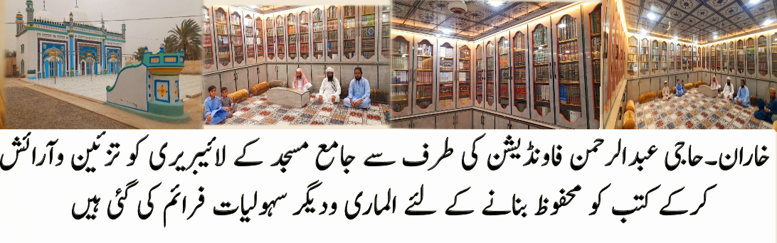 خاران ( رپورٹ محمدعیسی محمدحسنی )حاجی عبدالرحمن فاونڈیشن کے زیر اہتمام بانی رحمت اللہ بلوچ کے خصوصی دلچسپی کو مدنظر رکھتے ہوئے خاران کے قدیمی جامع مسجد کے لائیبریری کو جدید خطوط سے استوار کرنے کے لیے تزئین و آرائش کرکے دینی و نصابی کتب کو محفوظ بنانے کے لئے نئے الماری کی سہولیات فراہم کی گئی جس سے لائیبریری کے تمام کتابیں محفوظ ہونے کے ساتھ ساتھ ان کے حفاظت کو یقینی بنایا جا سکتا ہیں اس سلسلے میں حاجی عبدالرحمن فاونڈیشن کے بانی رحمت اللہ بلوچ جوکہ بلوچستان کے مختلف علاقوں بالخصوص خاران میں مختلف شعبوں میں اس طرح کے کئی کام کئیے ہیں جوکہ ان کے ذاتی دلچسپی کا واضح ثبوت ہیں وہ سیلاب زدگان کے ریلیف کے فراہمی ہو مختلف علاقوں میں مفت میڈیکل کیمپ کا انعقاد ہو مستحق اور نادار افراد میں مالی تعاون ہو بیواؤں میں سلائی مشین کی فراہمی ہو سمیت فری ایمبولینس سروس کی سہولیات ہو جوکہ مخیر حضرات کے تعاون سے اپنے خدمات سرانجام دیتے ارہے ہیں قدیمی جامع مسجد خاران کے لائبریری کو جدید تقاضوں سے ہم آہنگ کرنے کا مقصد اساتذہ کرام علماء کرام اور طلباء کو تحقیق اور مطالعہ کے بہترین مواقع فراہم کی جاسکتی ہیں اس سلسلے میں حاجی عبدالرحمن فاونڈیشن کی طرف سے لائبریری کو جدید سہولیات سے آراستہ کیا گیا ہیں، جس سے طلباء کو ایک معیاری تعلیمی ماحول میسر آئے گا، واضح رہے کہ جامع مسجد خاران میں قائم لائبریری میں علم و آگہی کے فروغ کا ایک اہم مرکز ہے، جسے جدید خطوط پر استوار کرنے کے لیے عملی اقدامات جاری ہیں، تاکہ یہ ادارہ حقیقی معنوں میں علم کا گہوارہ بن سکے۔ اور ساتھ حاجی عبدالرحمن فاونڈیشن کے بانی کی طرف سے یہ یقین دہانی کی گئی انشاءاللہ جو بھی ممکن ہوگی جامع مسجد کے بنیادی ضروریات کو پورا کرنے کی اقدامات کرتے رئینگے اور ساتھ ہی انشاءاللہ جلد جامع مسجد میں جائے نماز کےلئے قالین میہا کی جائے گئی دنیاوی زندگی کے ساتھ ساتھ دین کی خدمت کے لئے بطور مسلمان یہ ذمہ داریاں بنتی ہیں ہم سب ایسے نیک کاموں میں بڑھ چڑھ کر حصہ لیں جس سے اللہ پاک کی خوشنودی حاصل ہو۔ اور اس امید کےساتھ حاجی عبدالرحمن فاونڈیشن کے بانی رحمت اللہ بلوچ اپنے اس کارخیر کے تسلسل کو ہمیشہ کے لئے اسی طرح جاری وساری رکھے گے