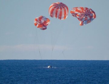 ناسا کے ماضی کے اپالو مشنز کی یاد تازہ کرنے والے ایک منظر میں، فوجی ہیلی کاپٹروں نے کیپسول کے ساتھ جڑی ہوا بھری کشتی سے خلابازوں کو ایک ایک کر کے فضا میں اٹھایا اور انہیں ایک مختصر سفر کے بعد بحریہ کے منتظر ریکوری بحری جہاز یو ایس ایس جان پی مرتھا پر پہنچا دیا۔