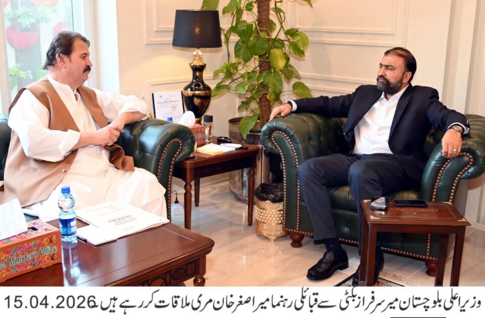 سبی(اللہ داد ) سبی اتحاد کے سربراہ میر اصغر خان مری نے گذشتہ روز وزیر اعلیٰ بلوچستان میر سرفراز خان بگٹی سے ملاقات کی۔ ملاقات کے دوران علاقائی سیاسی صورتحال، سبی میں عوام کو درپیش بنیادی سہولیات، امن و امان اور سیکیورٹی کے معاملات سمیت دیگر اہم امور پر تفصیلی تبادلہ خیال کیا گیا اس موقع پر میر اصغر خان مری نے سبی کے عوام کو درپیش مسائل، خصوصاً صحت، تعلیم، پانی اور دیگر بنیادی سہولیات کی کمی سے آگاہ کیا اور ان مسائل کے فوری حل کی ضرورت پر زور دیا۔ انہوں نے کہا کہ سبی کے عوام کو ریلیف فراہم کرنا حکومت کی اولین ترجیح ہونی چاہیے۔وزیر اعلیٰ بلوچستان میر سرفراز خان بگٹی نے اس موقع پر یقین دہانی کرائی کہ صوبائی حکومت عوامی مسائل کے حل اور علاقے میں امن و امان کے قیام کے لیے تمام ممکنہ اقدامات اٹھا رہی ہے۔ انہوں نے متعلقہ حکام کو ہدایت کی کہ سبی کے مسائل کے حل کے لیے مؤثر اور فوری اقدامات کیے جائیں تاکہ عوام کو ریلیف فراہم کیا جا سکے۔ملاقات میں باہمی دلچسپی کے دیگر امور پر بھی گفتگو کی گئی اور علاقے کی بہتری کے لیے مشترکہ کوششوں پر اتفاق کیا گیا۔